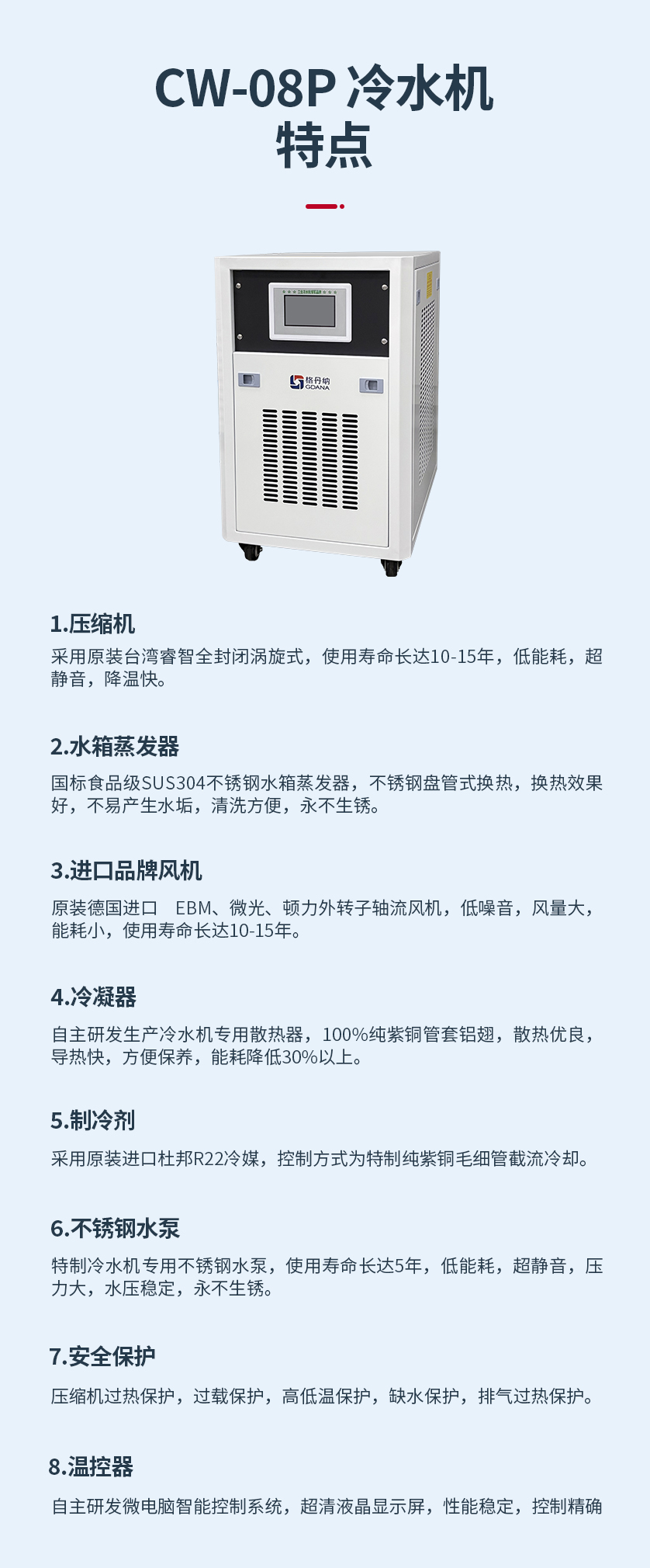 采用原裝臺(tái)灣睿智全封閉渦旋式,使用壽命長(zhǎng)達(dá)10-15年,低能耗,超靜音,降溫快。