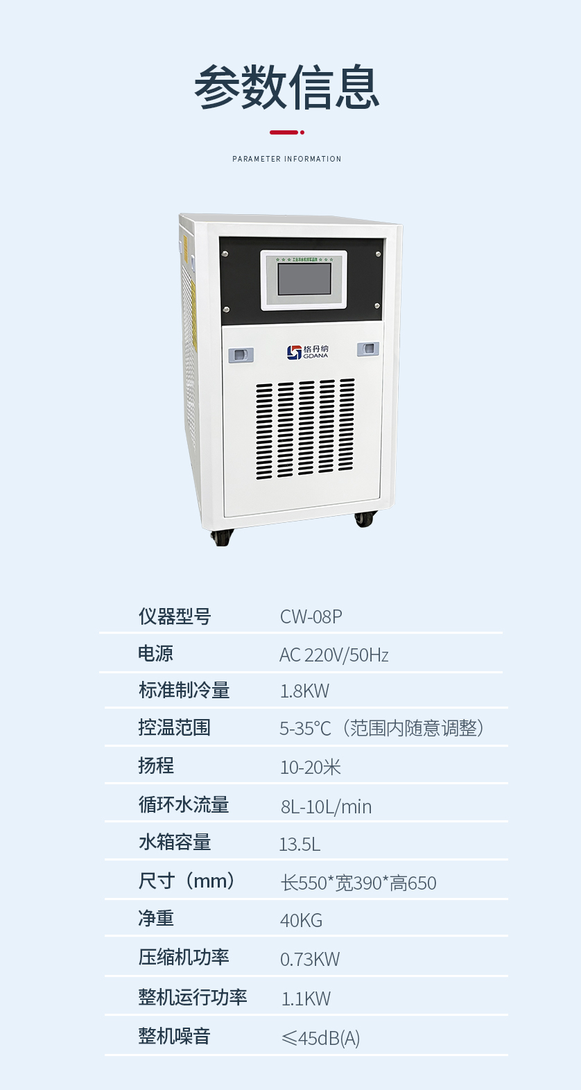 冷水機(jī)制冷系統(tǒng)將水箱內(nèi)的水冷卻,而后機(jī)器內(nèi)部的水泵把低溫的水注入需要冷卻的設(shè)備內(nèi)。水帶走機(jī)器內(nèi)部的熱量,變成高溫的水后回流到水箱進(jìn)行降溫,如此循環(huán)交換冷卻,起到為設(shè)備冷卻的作用。
