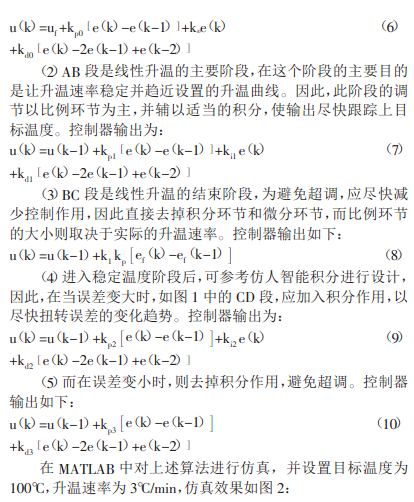 根據(jù)系統(tǒng)特性,設(shè)計控制規(guī)則如下: (1)在啟動階段,由于系統(tǒng)存在一定的時滯和較大的慣性,必須加以比較強(qiáng)的控制作用,才能使系統(tǒng)盡快響應(yīng)因此應(yīng)根 據(jù)本階梯的穩(wěn)定溫度和升溫速率加入前饋控制量 ,控制器輸出為: