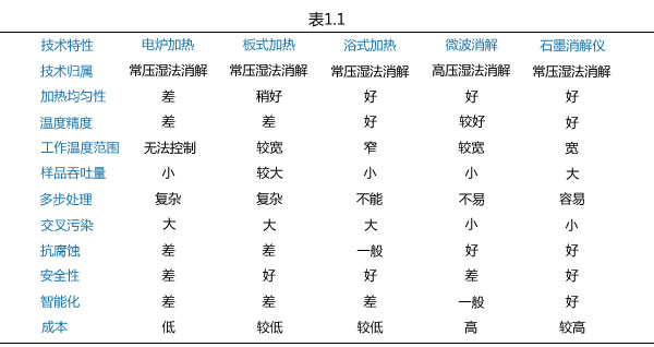 石墨消解儀與其它消解設(shè)備的特性對(duì)比如表1.1