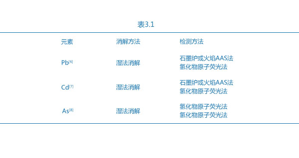 在食品進(jìn)出口中,重金屬是必檢項(xiàng)目,其消解方法和檢測方法見表3.1。