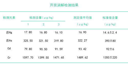 本試驗(yàn)采用的石墨消解儀硝酸濕法消解方式,僅需1次前處理方法,可以同時(shí)檢測(cè)鎘、鉻、汞和砷4種重金屬元素,操作簡(jiǎn)便,試劑耗材消耗量少,石墨消解儀消解芹菜,節(jié)約了成本,具有批處理量大且無(wú)需實(shí)驗(yàn)人員值守的優(yōu)點(diǎn),安全性系數(shù)高,一般性實(shí)驗(yàn)室均可采用。本實(shí)驗(yàn)只用硝酸硝解樣品,對(duì)樣品進(jìn)行預(yù)消解處理,安全系數(shù)高,樣品空白成分簡(jiǎn)單,空白值低。
