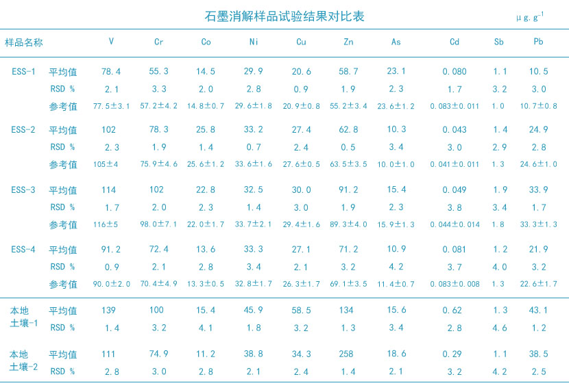 分別準確稱取ESS-1、ESS-2、ESS-3、ESS-4、本地土壤-1和本地土壤-2各6份,樣品轉移至全自動石墨消解儀樣品管中,放進相應的樣品位置,全自動消解進行前處理,統(tǒng)測定消解液中10種重金屬元素的含量。全自動消解測定結果數(shù)據(jù)見下面表格。本方法測定的標準樣品均值都在保證值范圍內(nèi),準確度可靠;相對標準偏差在0.5%-4.6%之間,具有較好的精密度。