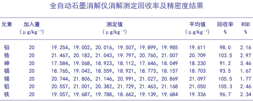 《中國(guó)藥典》中有規(guī)定了中藥中鉛、鎘、砷、汞、銅的檢測(cè)方法,對(duì)于沙星類抗生素中的其它金屬元素殘留未作規(guī)定。本文采用全自動(dòng)石墨消解儀酸消解方法對(duì)樣品進(jìn)行前處理消解,測(cè)定左氧氟沙星膠囊中鉛、鉻、砷、鎘、錫、鋁、鐵7大金屬元素含量。消解儀高程度自動(dòng)化消解,操作簡(jiǎn)單、批處理量大,解放人力繁瑣操作,大大提高工作效率。