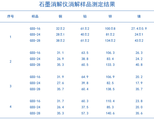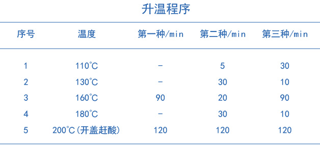 分別準(zhǔn)確稱取(GSS-16)、(GSS-24)、(GSS-28)標(biāo)準(zhǔn)樣品各為0.200g置于聚四氟乙烯消解管中,用少量水濕潤,加入一定比例的硝酸、高氯酸、氫氟酸和鹽酸,按照無線平板上的程序升溫加熱(升溫程序如下圖表1所示),消解管加蓋,上機(jī)消解,開蓋,繼續(xù)趕酸至消解管內(nèi)只剩下透明粘稠近干膏狀物,待消解管溫度降至室溫,取出消解管在通風(fēng)櫥中,用慢速定量濾紙將消解后溶液過濾并用高純水定容至25mL容量瓶內(nèi),上機(jī)測定。樣品做三個平行,同時做試劑空白。