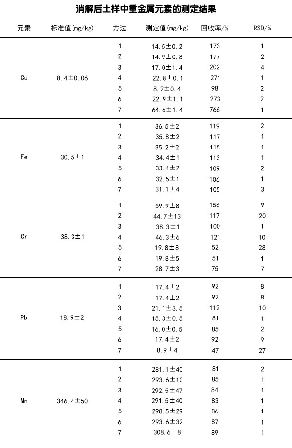 討論:不同類(lèi)型的土壤中重金屬含量有較大差異,不同消解方法對(duì)重金屬含量分析的影響也有差異。文中選用的7種消解方法對(duì)標(biāo)準(zhǔn)土樣Cu、Fe、Mn、Pb、Cr含量的測(cè)定值顯示,只有Fe、Mn含量的測(cè)定值在標(biāo)準(zhǔn)值范圍內(nèi),Cu含量在HCIO4蒸干的條件下測(cè)定值不在標(biāo)準(zhǔn)范圍內(nèi),Pb含量在HNO3蒸干、HF蒸干、HClO4蒸干以及HNO3、HClO4同時(shí)蒸干、HNO3、HF、HClO4同時(shí)蒸干的條件下測(cè)定值不在標(biāo)準(zhǔn)范圍內(nèi),Cr含量在只有HClO4蒸干的條件下測(cè)定值在標(biāo)準(zhǔn)值范圍內(nèi)。