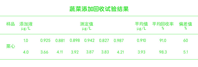 菜心樣品分別添加水平為1.0、4.0μ/gL的標(biāo)準(zhǔn)使用液,試驗設(shè)各個平行,各樣品加標(biāo)回收率和精密度的結(jié)果如下表所示。