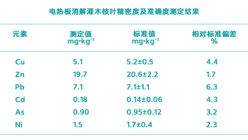 為了試驗實驗方法的精密度及準確度對國家標準物質(zhì)灌木枝葉(GBW07602)標樣進行消解測定,將樣品稱取6份,按電熱板消解方法進行消解測定,測定結果見“電熱板消解灌木枝葉消解測定精密度和準確度結果”表。