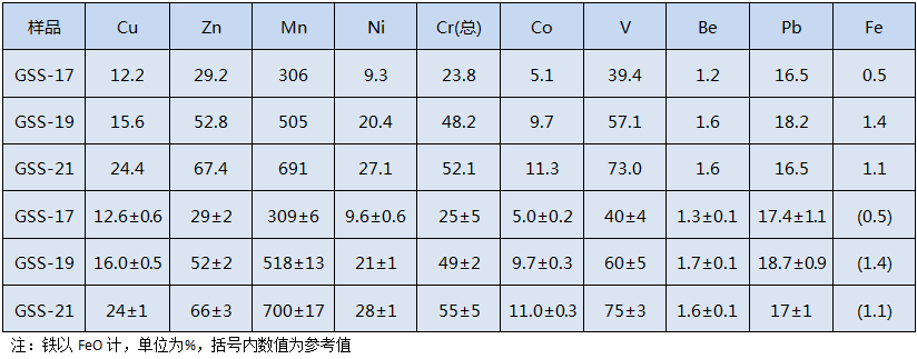 用HCl+HNO3+HF+HC104四酸全消解體系通過陶瓷電熱板濕法消解土壤樣品,進(jìn)行3種不同加酸過程對GSS-17、GSS-19和GSS-21標(biāo)準(zhǔn)土壤樣品進(jìn)行3次平行預(yù)處理,測定土壤中銅、鋅、錳、鎳、總鉻、鉆、釩、鈹、鉛、鐵l0種重金屬元素,結(jié)果如下表所示。