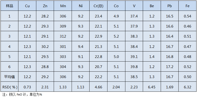 從上表結(jié)果得出,各元素的相對標(biāo)準(zhǔn)偏差在0.73%~6.45%之間,符合實驗室要求,方法適用于環(huán)境樣品預(yù)處理。