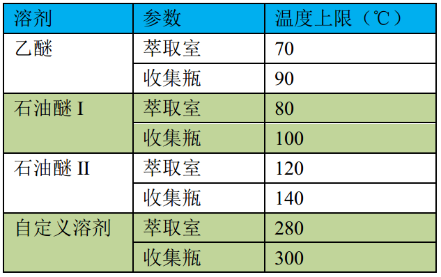 4) 為避免設(shè)置錯(cuò)誤,儀器對(duì)預(yù)設(shè)的幾種常用溶劑限定了溫度設(shè)置范圍,具體如下: